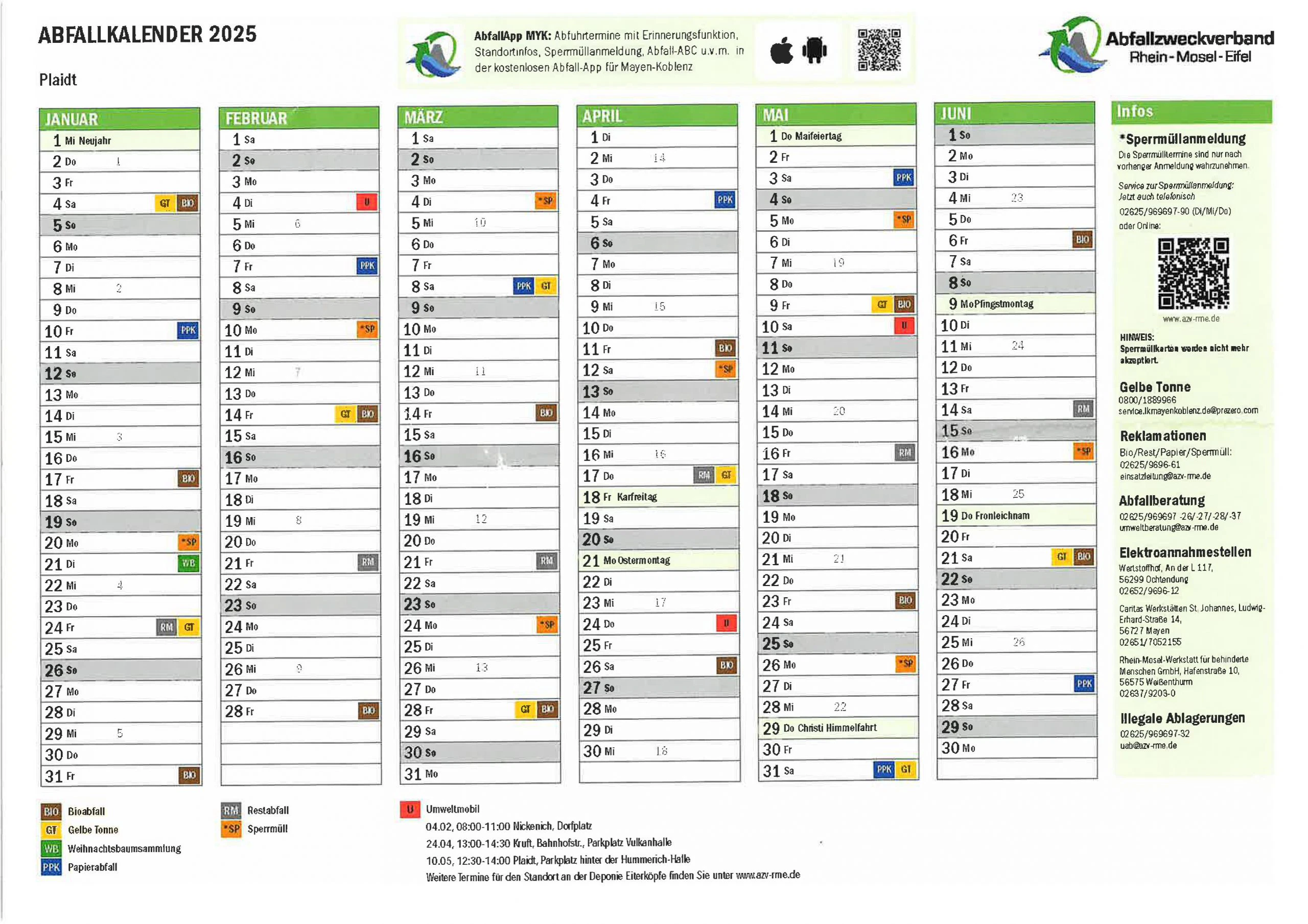 Nachfolgend veröffentlichen wir die Abfuhrtermine des Abfallzweckverbandes Rhein-Mosel-Eifel für 2025.