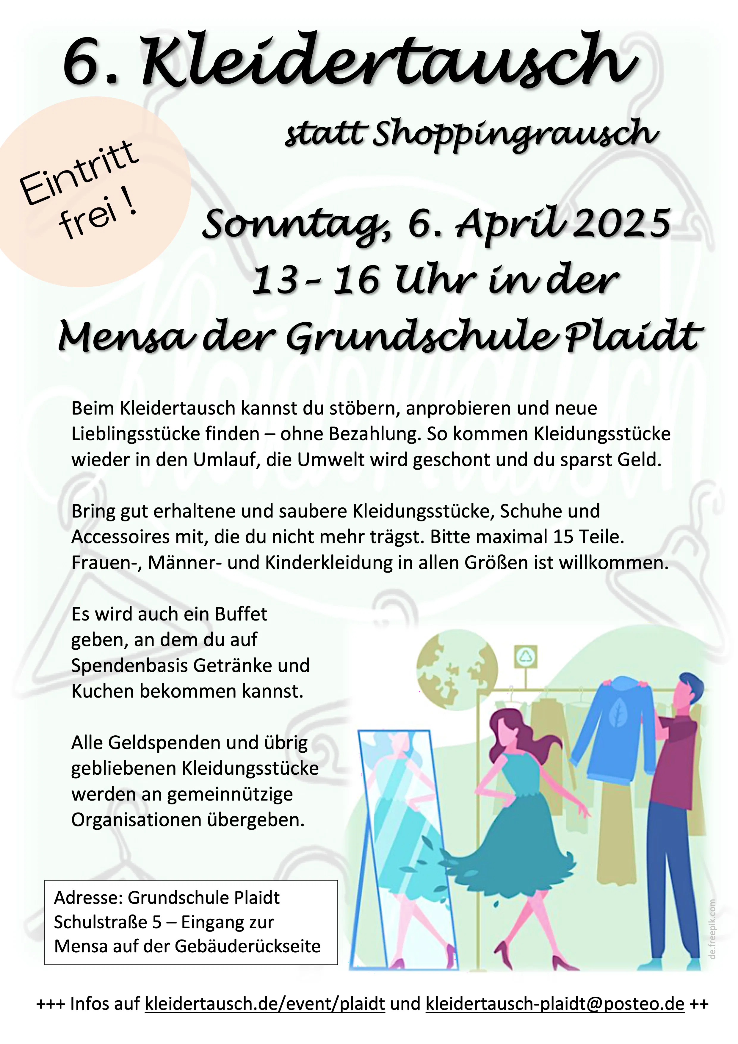 Text der Veranstaltenden: „Am Sonntag, 6. April 2025 findet endlich wieder ein Kleidertausch in Plaidt statt. Bring gut erhaltene und saubere Kleidungsstücke (maximal 15 Stück), Schuhe und Accessoires mit, die
