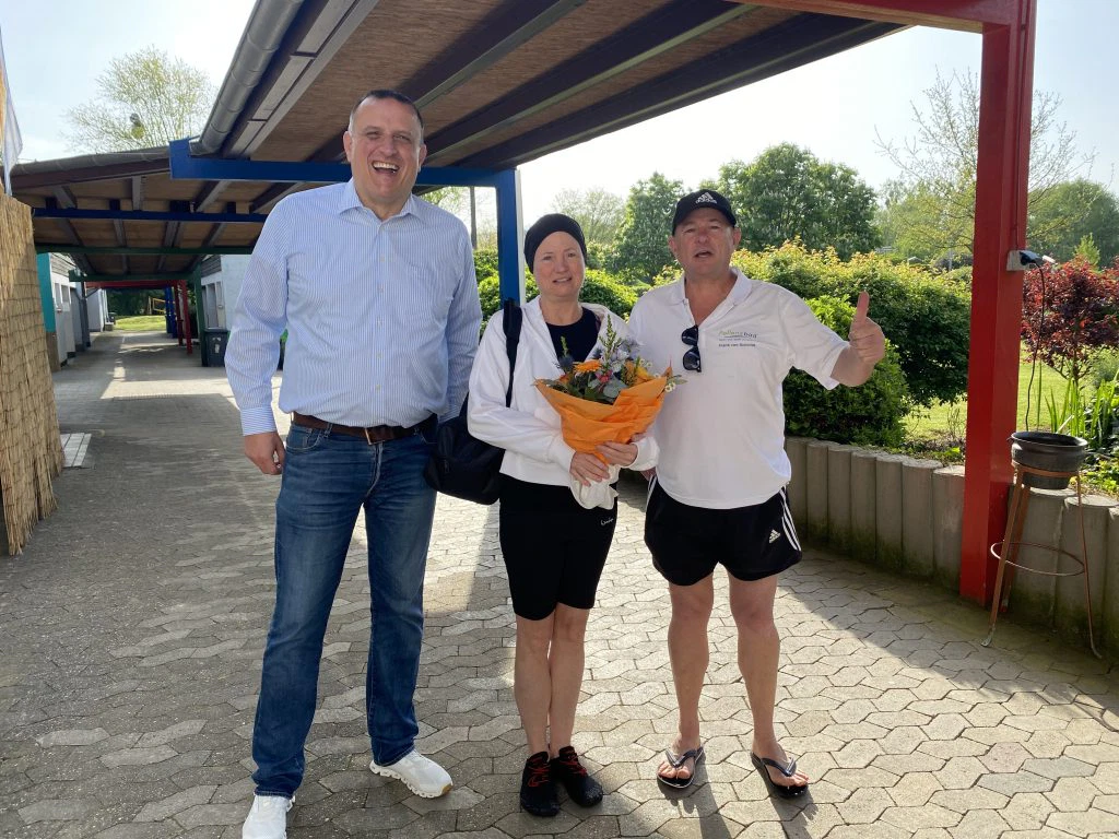 Pünktlich zum 01. Mai hat das Freibad Pellenz nunmehr seine Pforten für die Besucherinnen und Besucher geöffnet. Schwimmmeister Frank von Schmidt und ich als Verbandsvorsteher begrüßten mit  Bettina Heer die erste Schwimmerin des Jahres.