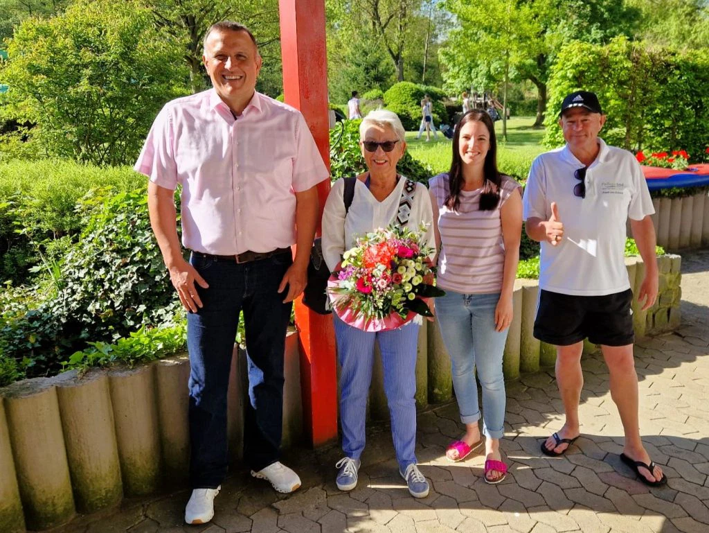 Astrid Franke (auf dem Foto 2. v. l.) aus Koblenz wurde als erster Badegast der Saison mit einem Blumenstrauß begrüßt.