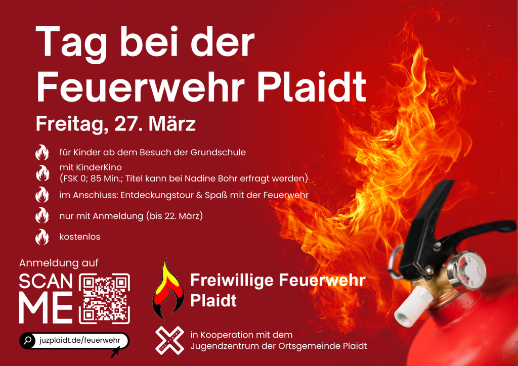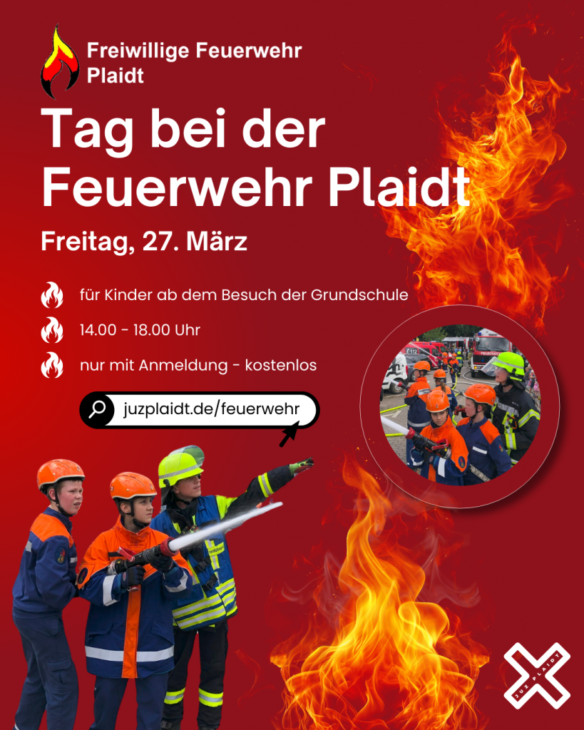 Die Teilnahme an der Veranstaltung ist kostenlos. Eine Anmeldung ist jedoch erforderlich und bis zum 22. März online unter juzplaidt.de/feuerwehr möglich.