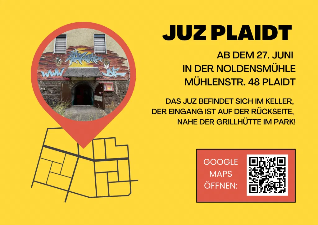 Die eigentlichen Räume des Jugendzentrums befinden sich im Keller der Noldensmühle in der Mühlenstraße 48 in Plaidt. Die Noldensmühle befindet sich am Rande des Plaidter Parks zwischen dem Seniorenzentrum Maria vom Siege und der Grillhütte.