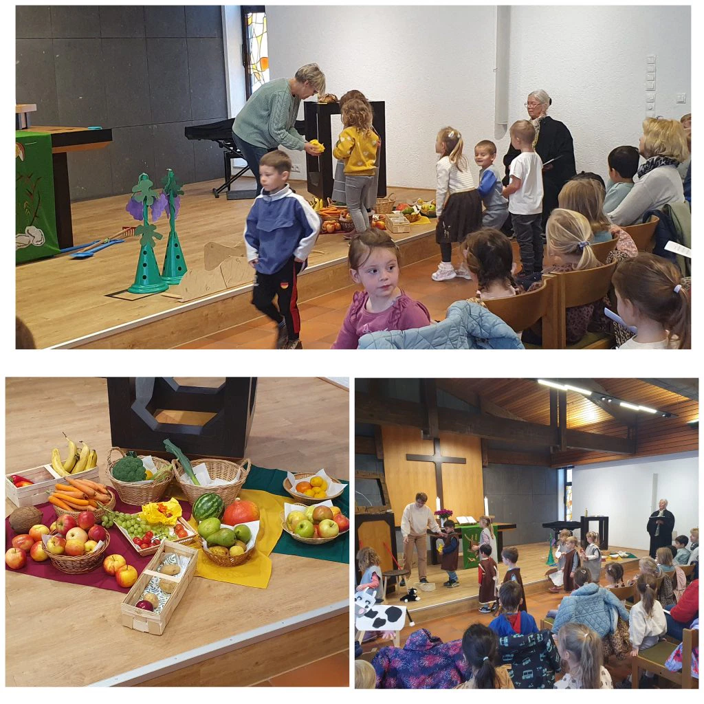 Auch einige Eltern folgten der Einladung. Im Gottesdienst führten einige Kinder ein Rollenspiel zum Thema „Erntedank mit Noah“ auf: Noah, seine Familie und alle Tiere waren nach 40 Tagen mit ihrer Arche am Berg Ararat gelandet. Sie bauten Häuser, Scheunen für die Tiere und bewirtschafteten die Äcker. Als die Zeit der Ernte kam, dankte Noah und seine Familie Gott für all die vielen Gaben.