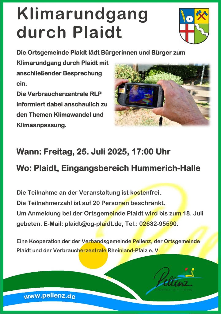 Die Ortsgemeinde lädt alle interessierten Bürgerinnen und Bürger zum Klimarundgang durch Plaidt mit anschließender Besprechung am Freitag, 25. Juli 2025, um 17:00 Uhr an die Hummerich-Halle ein.