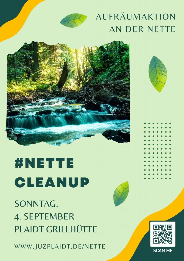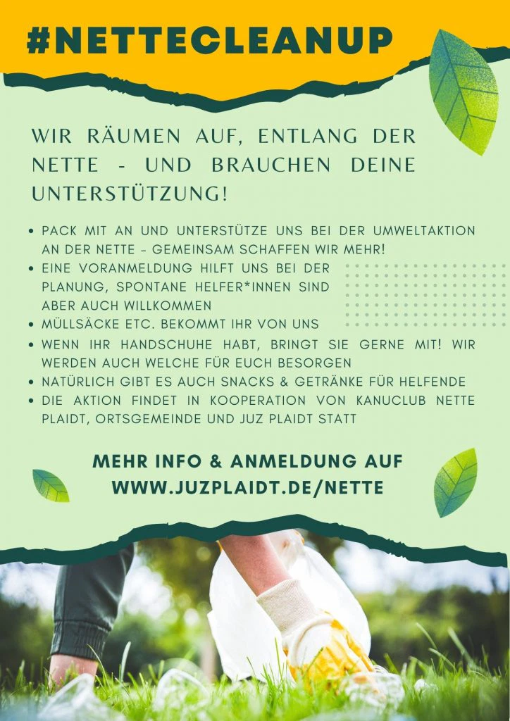 #nettecleanup ist die Aufräumaktion entlang des Flusses Nette in Plaidt, die in diesem Jahr am Sonntag den 4. September, dem letzten Tag der Sommerferien, stattfindet. Zur Unterstützung der Aktion werden noch Helfer*innen jeglichen Alters gesucht, damit ein möglichst großer Bereich aufgeräumt und gesäubert werden kann. Interessierte können sich anmelden unter www.juzplaidt.de/nette , dort gibt es auch weitere Informationen zur Aktion.
