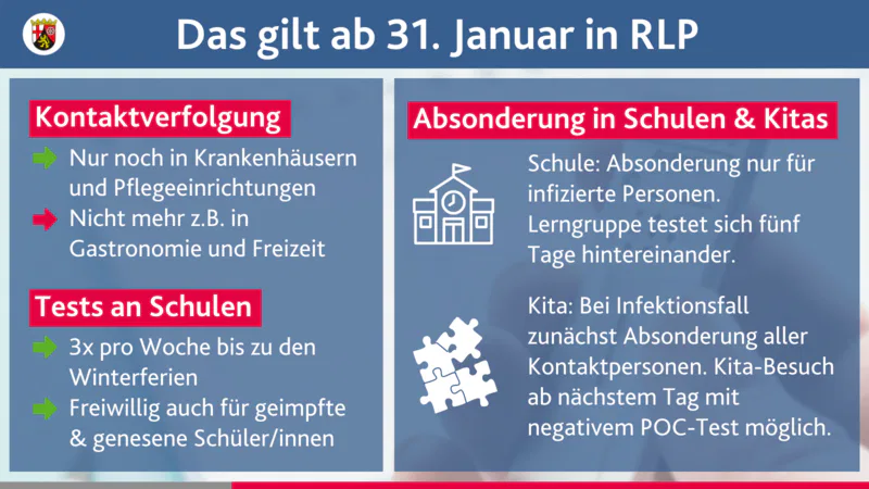 Schulen: Zur Absonderung verpflichtet werden nur noch infizierte Schülerinnen und Schüler oder Lehrkräfte. Der Rest der Lerngruppe testet sich in den darauffolgenden fünf Schultagen täglich selbst. Die Zahl der anlasslosen Tests pro Woche wird in Schulen von zwei auf drei Testungen erhöht.