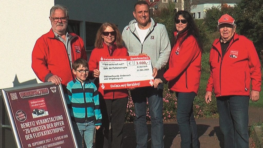 Es war den Oldtimerfreunden ein besonderes Anliegen, auch den Betroffenen von der Flutkatastrophe an der Nette eine finanzielle Hilfe als Unterstützung zu ihrem Wiederaufbau durch den Orstbürgermeister zukommen zu lassen.