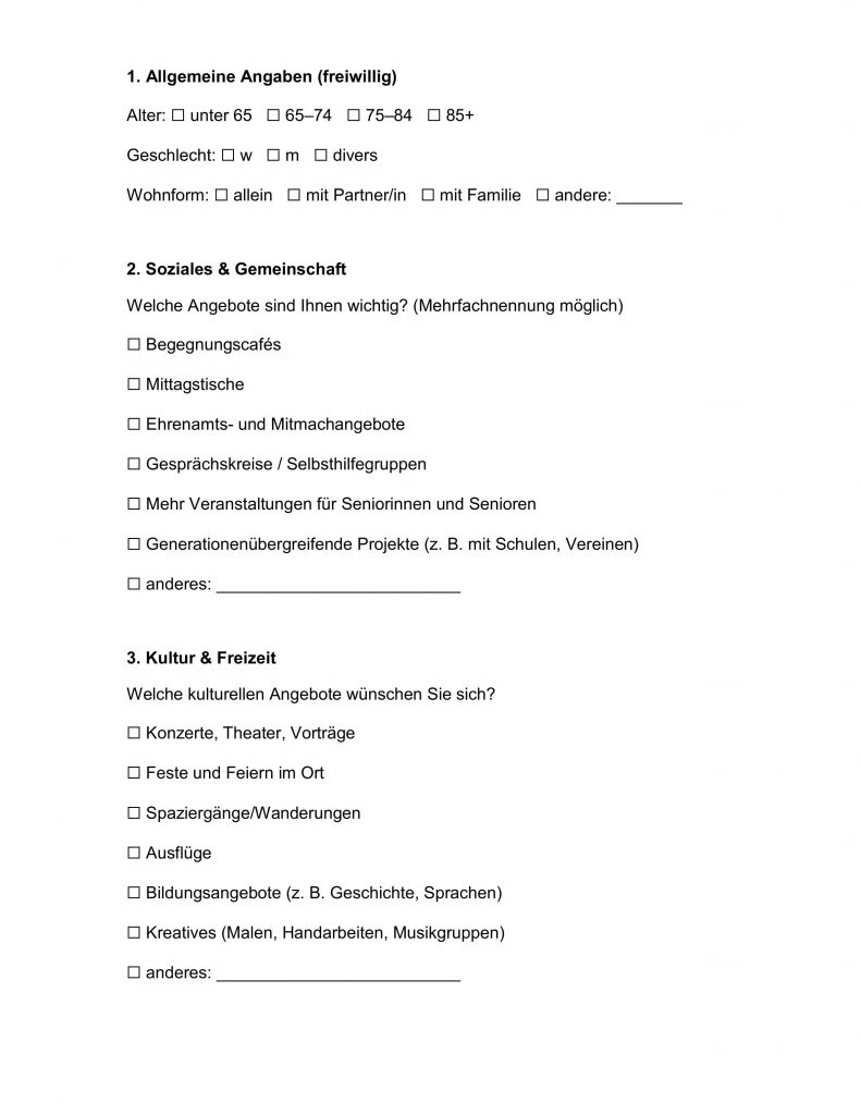 Mit dieser Befragung wollen wir erfahren, welche Angebote Sie sich wünschen, wo es Verbesserungsbedarf gibt und welche Ideen und Wünsche Sie für die Zukunft haben. Die Rückmeldungen helfen uns, die richtigen Schwerpunkte in der Seniorenarbeit zu setzen und konkrete Maßnahmen vor Ort anzustoßen.